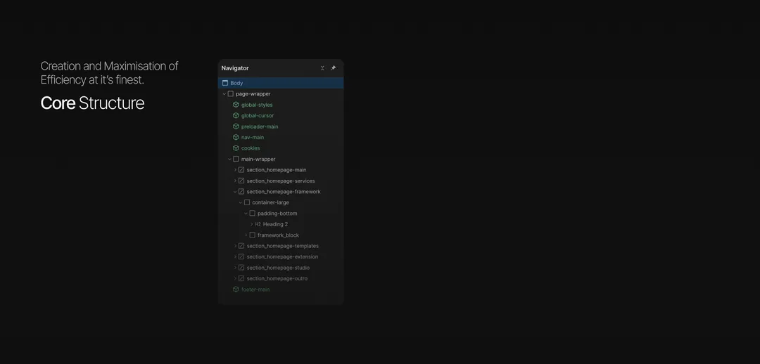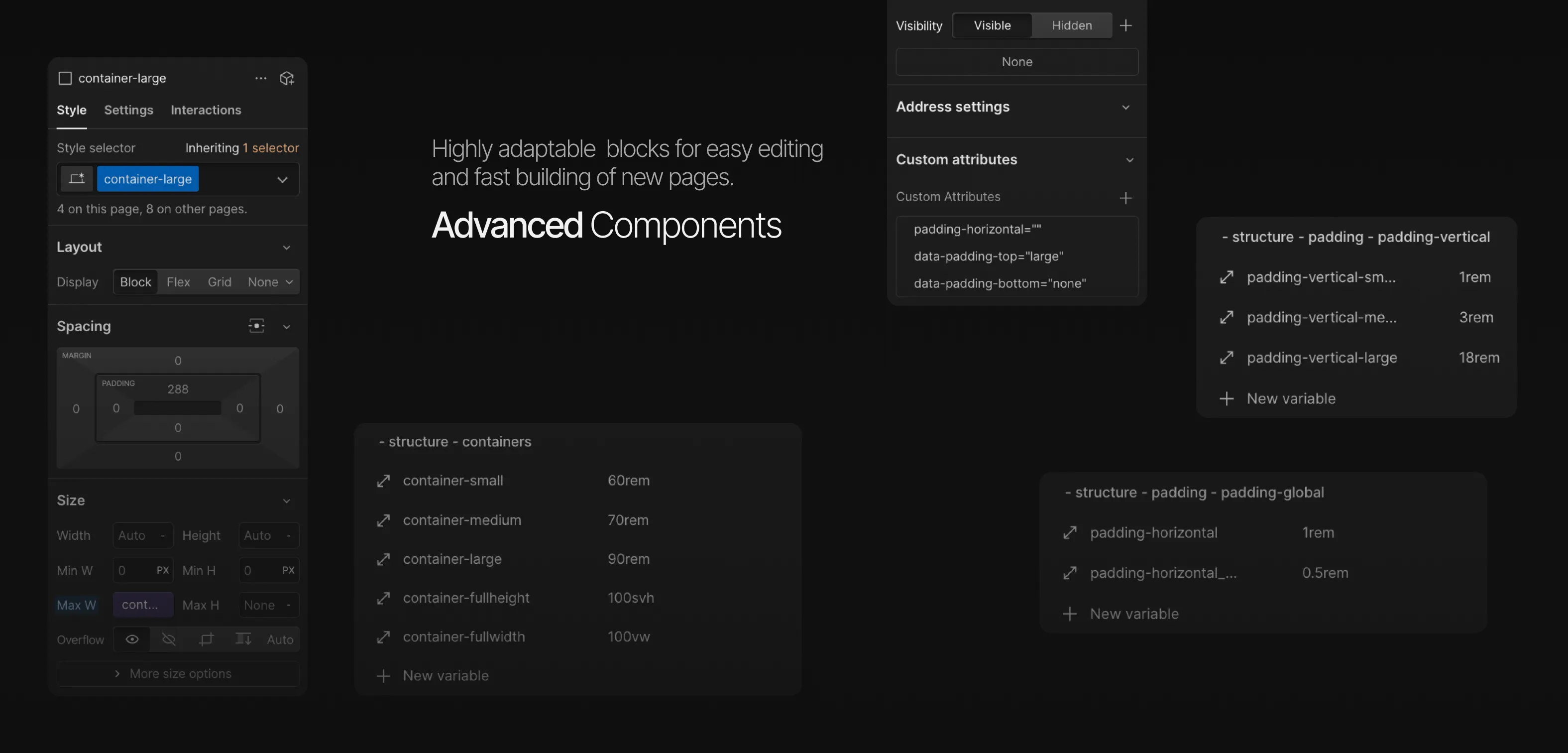 - Styling: each container size has corresponding max widths connected via Webflow’s Variable System (max-width=container-size within Variable Setup)